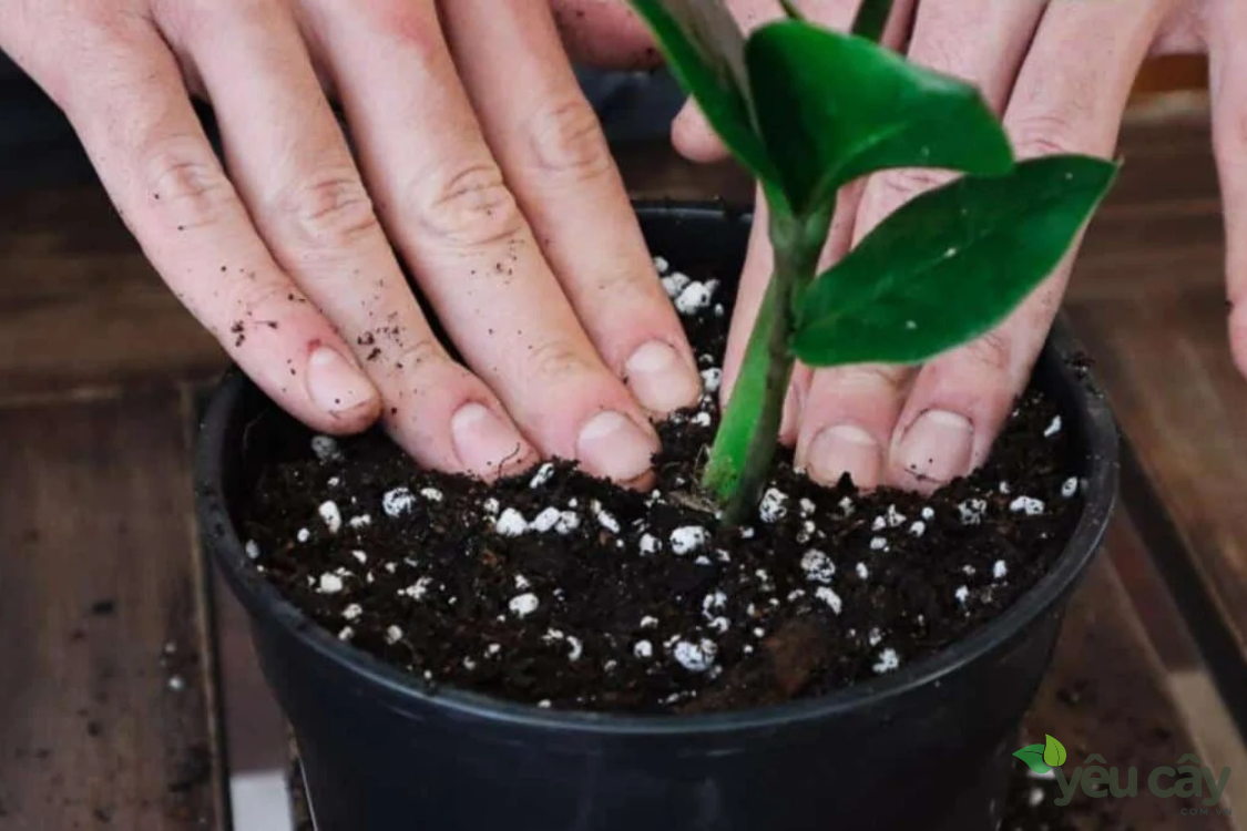 Bước 3: Đặt cây kim tiền vào chậu, chú ý không để rễ bị gập hay bị tổn thương. Giữ cho cây thẳng đứng, không nghiêng ngả
